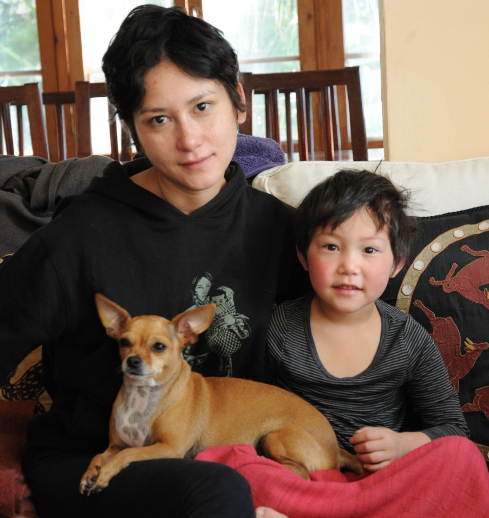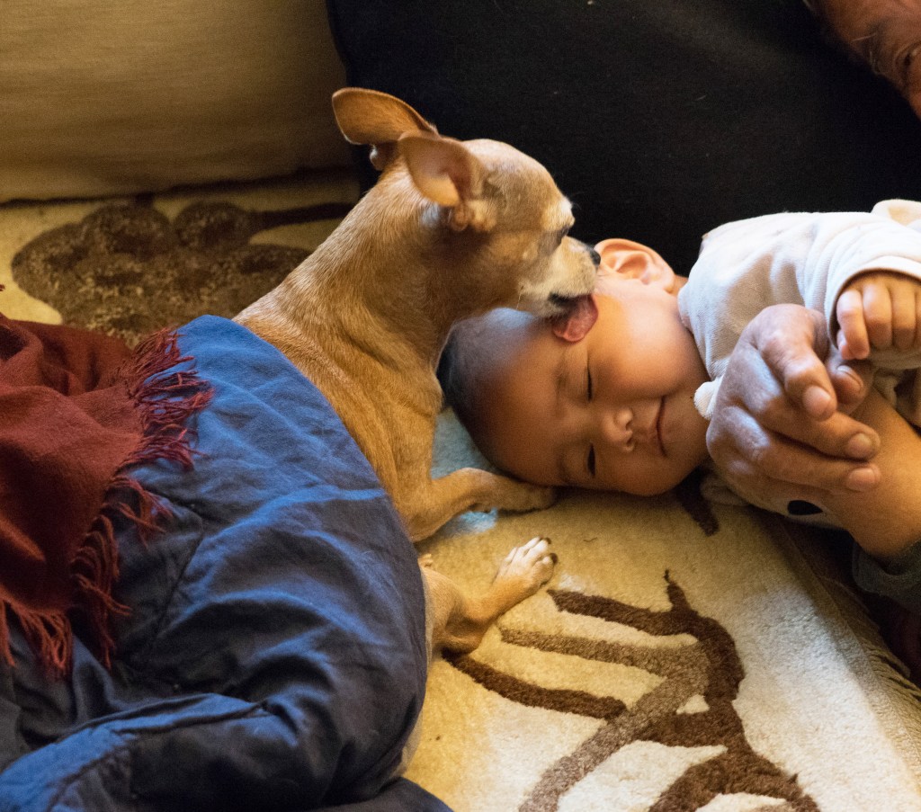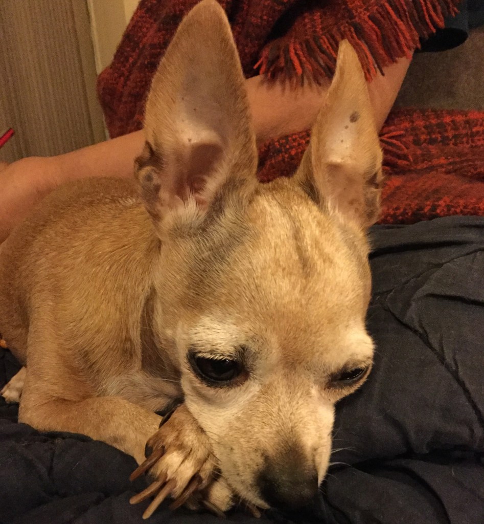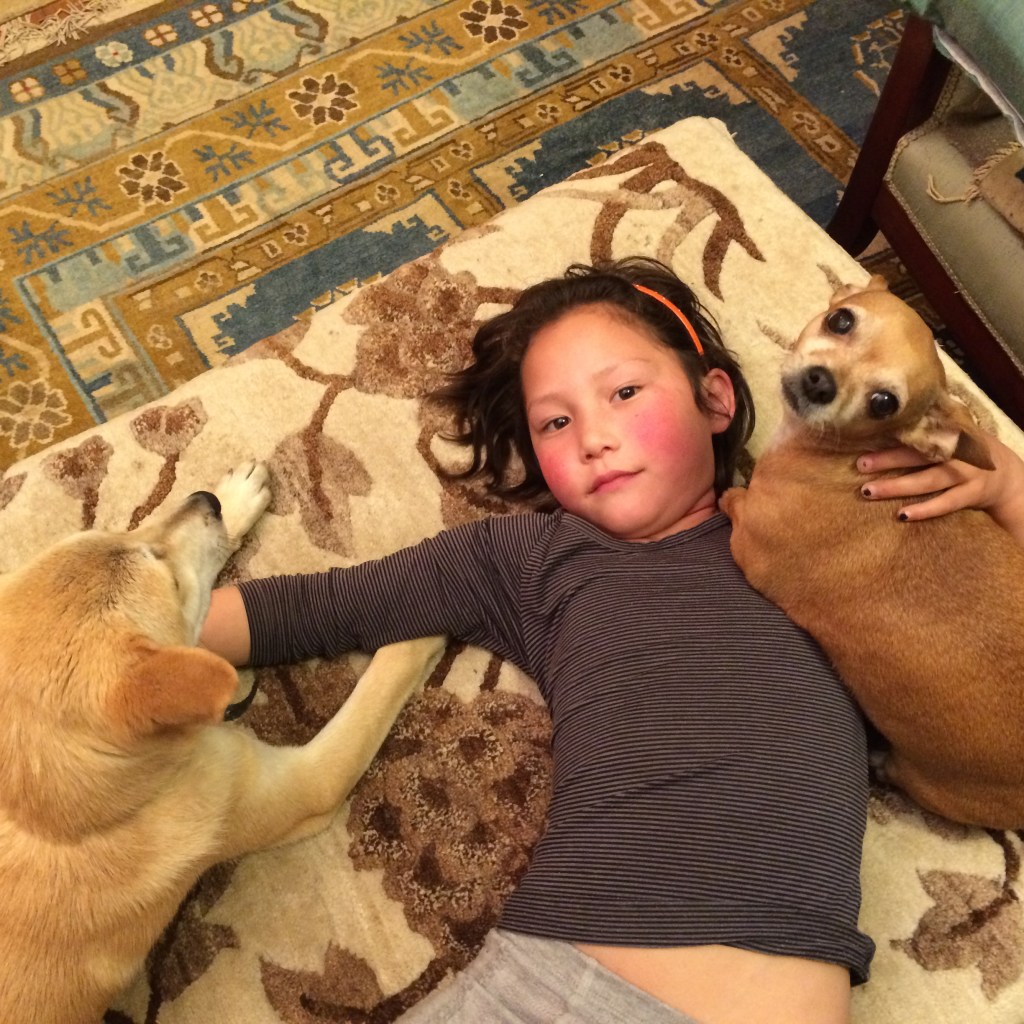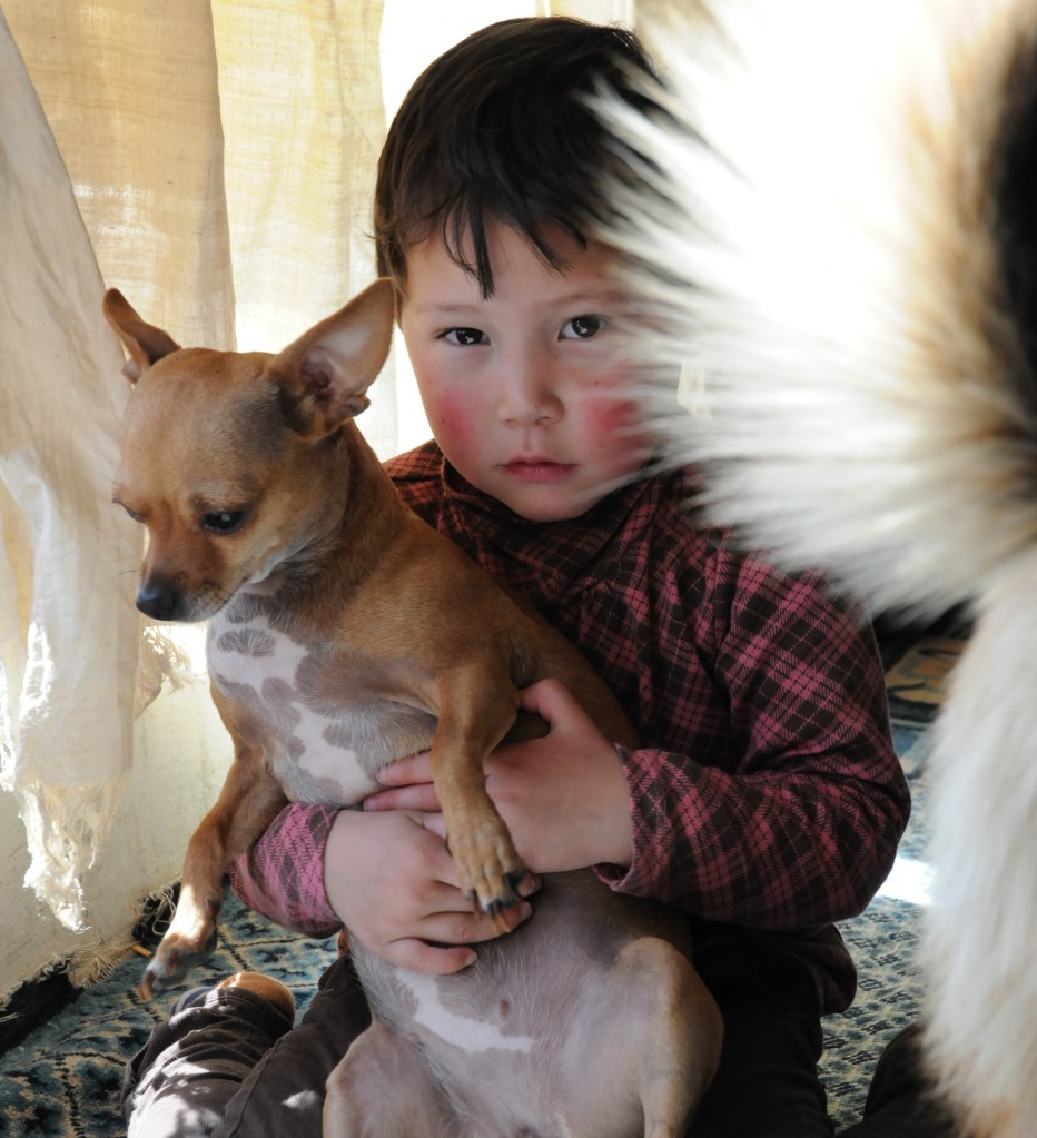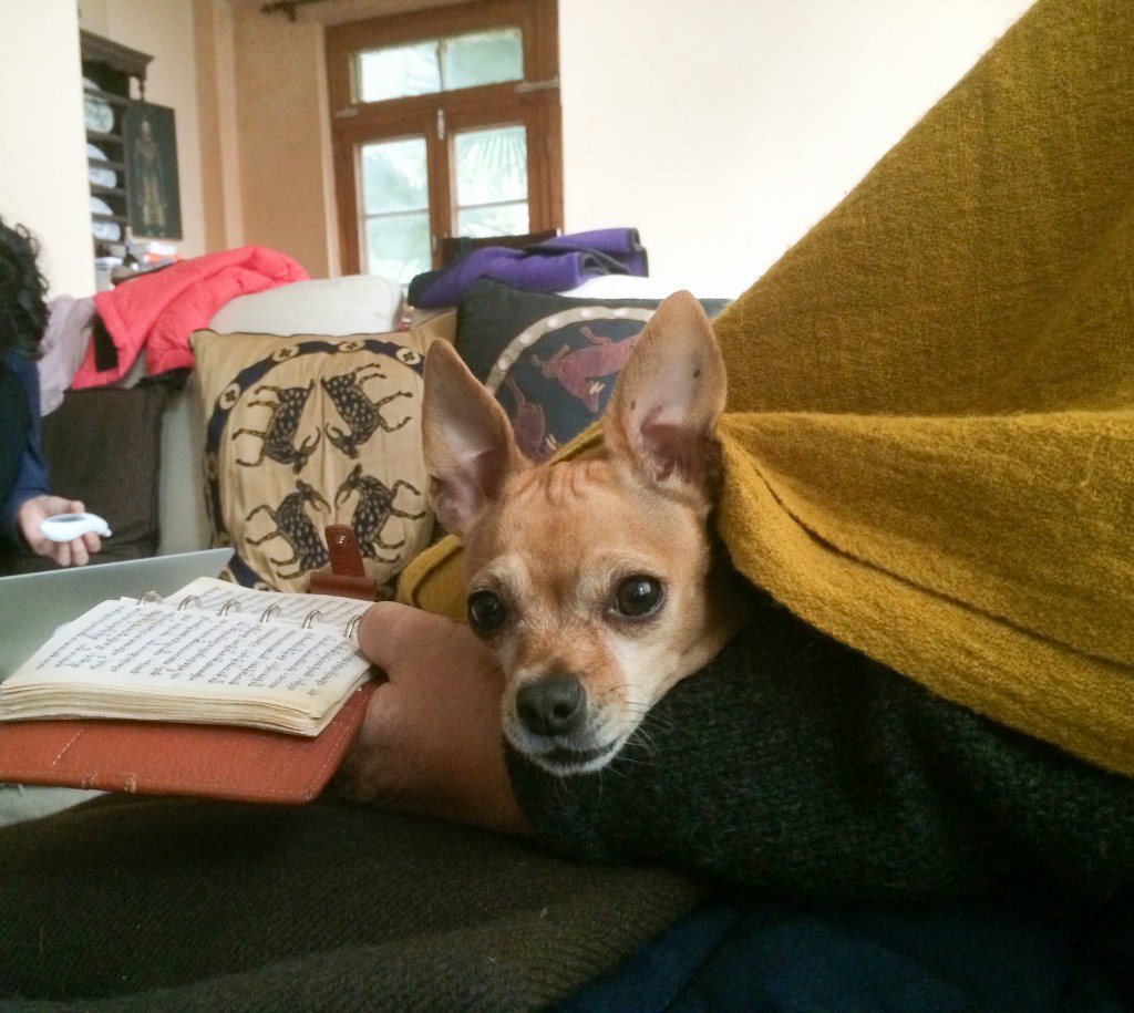 She was a quiet little thing who rarely barked. She got along with our many other dogs, displaying a laissez-faire attitude, only protesting when they infringed on her space and their proximity to her master. She shared her favorite toy with Luna, Sochoe’s Shitzu, and let her clean her ears. The lack of movement and the frequent snacks Kalsang doled out to her made her look like a barrel on sticks, and we had to struggle to convince Kalsang to hold back. She spent her time on his lap, sometimes hidden under a blanket, bursting out of cover to attack anyone who dared to approach him or hold out their hand. She was jealous of the increasing number of grandchildren, her only true competition, and barked threateningly and nipped at them when they came for a goodnight kiss, though she did show good will when Kalsang was not involved.