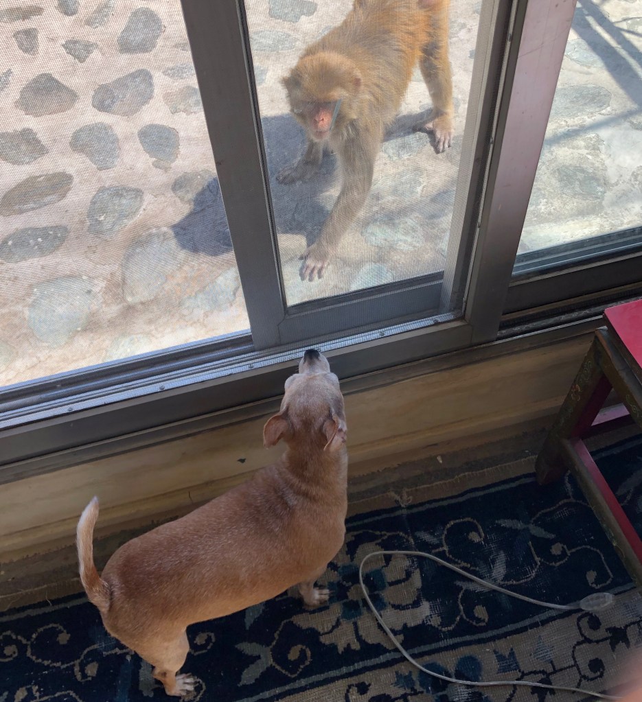 After a careful study, she bought Chichi in Delhi and brought her to us in a bag. She was a tiny, perky thing, and Kalsang was delighted. I cared for her, and then she became Sochoe’s dog, my being away so much. She became best friends with Sochoe’s dog Daisy. This highly intelligent and class-conscious (former) stray highly valued Chichi’s pedigree and ensured she didn’t associate with others like herself.